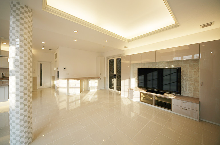 リビングのデザインでは、柱の装飾にハート型タイルを提案。豪奢な中に「カワイイ」を効かせるアイデアが当時中学生だったご息女の感性に響き快諾された。完成後には外壁が建材メーカーのカタログに採用され、顧客の喜びをさらに大きくした。